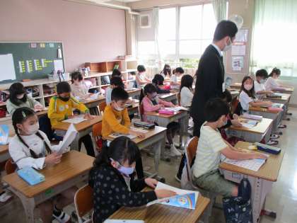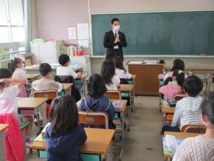 外国語活動の時間です。外国語の先生との初めての授業。先生と子どもたちで自己紹介をしました。これからはじまる外国語活動の勉強。子どもたちは楽しみにしていると思います。