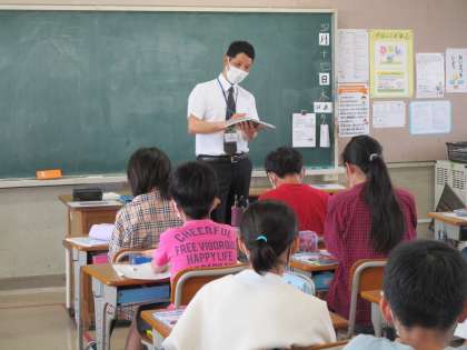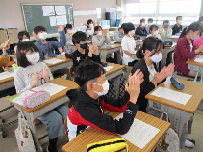 外国語の時間です。英語の先生との初めての授業。「5年生の外国語で楽しかったことは」など…「外国語のアンケート」のあと,自己紹介をしました。先生と子どもたちは,いい雰囲気で外国語がスタートできたようです。