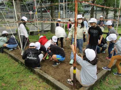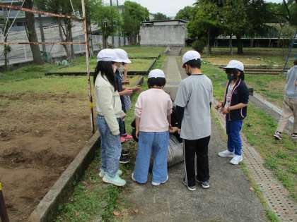 理科の時間です。今日は,みんなで学習園の整備をしました。草抜きをやりスッキリ。4年生では,「ひょうたん」を植えます。