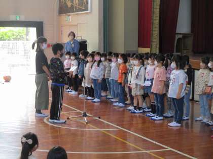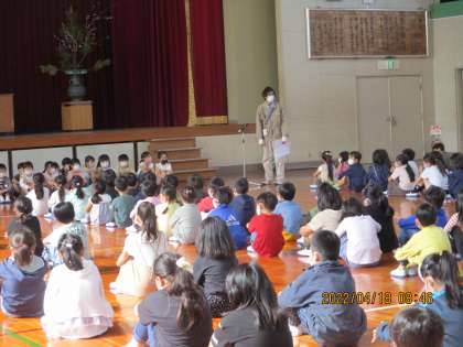 月曜集会で対面式を体育館で行いました。私からの話の後,児童会代表の歓迎のメッセージ。そのあとボールと長なわとびのプレゼント。1対面式を体育館で行いました