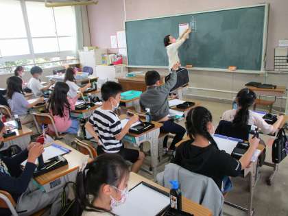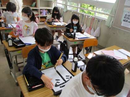 国語の書写の時間です。はじめての「毛筆」でした。先生から習字道具の使い方の説明。そのあと,筆で自由に書きました。はじめての「毛筆」うまくかけたかな?