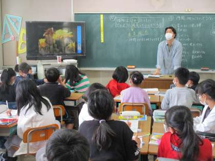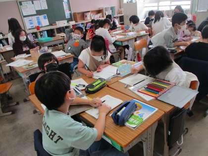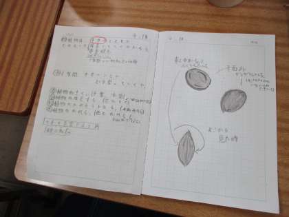 理科の時間です。課題は「植物は,季節とともにどのように成長していくのだろう」。春夏秋冬で植物の成長を予想。学習園で「へちま」を育てて確かめます。ノートに「ヘチマ」の種を観察しました。