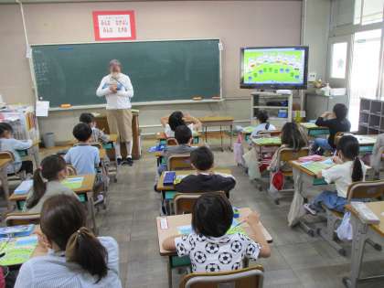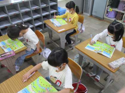 算数の時間です。「かず」の勉強をしました。イラストを使って,どちらが多いにチャレンジ。線でつなぎながら数を確認。うまく,どちらが多いかわかったようです。勉強がんはっています。