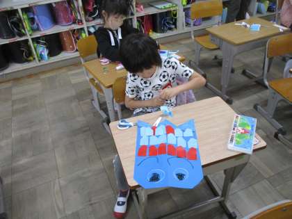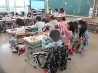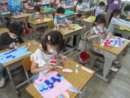 図工の時間です。「こいのぼり」づくりに取り組んでいます。今日は,折り紙でウロコをはっていよいよ完成。かわいい「こいのぼり」ができそうです。