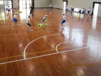 7ボールをしました。対戦型のゲームで,フィールド上の7つのボールのうち,3つのボールを自チームのサークルに置いたチームが勝利となります。
