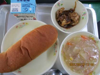 今実の献立は,コッペパン,ミルク,米粉マカロニスープ,鶏肉のバーベキューソースの4品です。