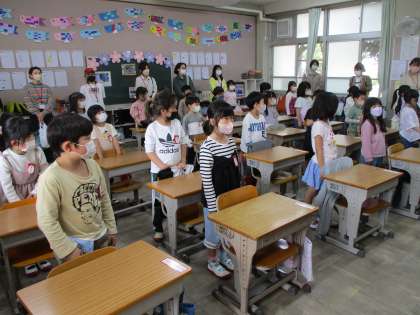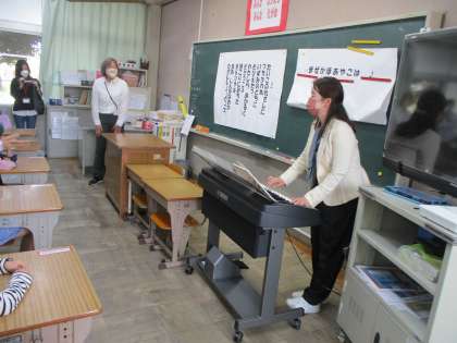 最初の参観日です。音楽に取り組みました。音楽の先生と「校歌」チャレンジ。やる気いっぱぃでしっかり歌うことができました。お家の方にも,がんばっている姿を見てもらえたと思います。よくがんばりました。