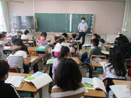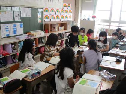 国語の時間です。「白いぼうし」を勉強しています。今日の問いは「「よかったね」「よかったよ」はだれとだれでしょう」。モンシロチョウ(なかま)とモンシロチョウ(女の子)など…いろいろな意見がでて,子どもたちは物語をしっかり読み取っているようでした。今日の問いの答えは…。