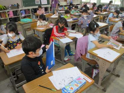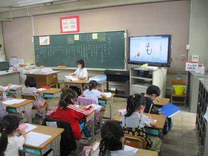国語の時間です。今日はひらがなの「し」と「も」を勉強しました。言葉集めと書き順を確認。そのあとワークシートでしっかり練習しました。「し」と「も」,みんなしっかり書けていましたよ。