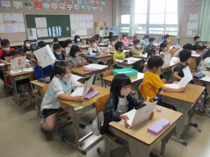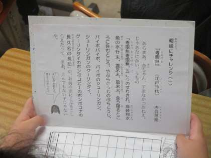 朝の会です。音読の練習で落語の「寿限無」をみんなでチャレンジ。はじめはゆっくりと,終わりには少しスピードアップ音読できていました。音読を楽しんでいました。