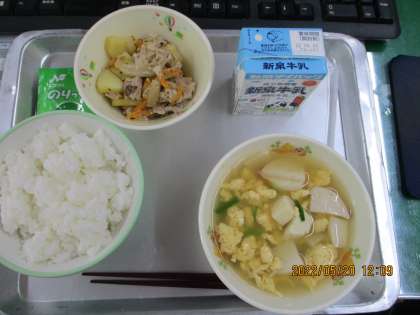 本日の献立は,ごはん,ミルク,かきたま汁,豚肉のマスタード焼き,ふりかけの5品です。