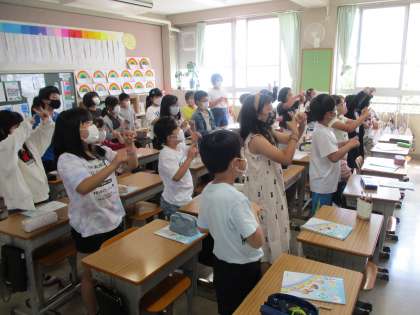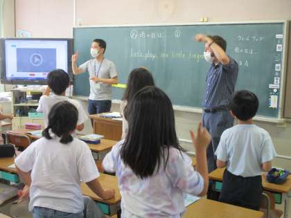 外国語活動の時間です。今日は英語の先生とNS先生と一緒に勉強しました。めあては「雨の日は…」。先生から雨の日に楽しめるゲームを教えてもらいました。大いに盛り上がり,楽しそうでした。雨の日にやってみてくださいね。