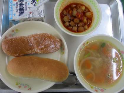 本日の献立は,ミニパン,揚げパン,ミルク,ワンタンスープ,ウィンナーのトマト煮の5品です。