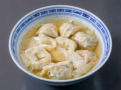 ワンタンは中国西部・中国南部で生まれた料理です。餃子のようにひき肉などで作った餡を専用の生地で包み,揚げたり,蒸したり,スープに入れたりしていただきます。本日のワンタンスープは餡を包まない中華平麺を使っています。
