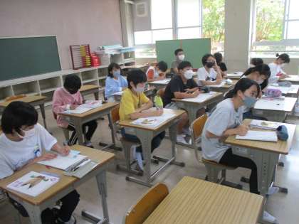 算数の時間です。「分数のかけ算」を勉強しています。めあては「帯分数や3つの計算をしよう」。みんなで計算の仕方を考えました。「帯分数は仮分数になおす」を確認。3つの分数のかけ算の仕方はどうだったかな?