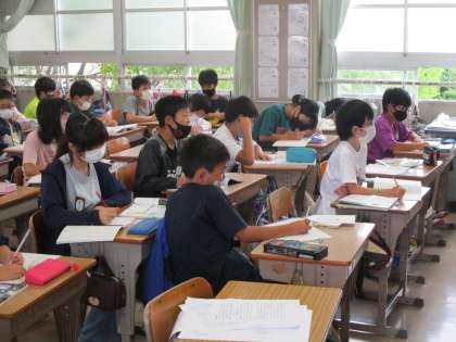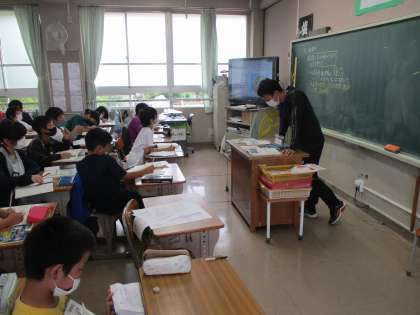 社会科の時間です。「いろいろな土地のくらし」を勉強しています。めあては「変わった土地のくらしの工夫を知ろう」。木曽三川に囲まれた海津市の土地の様子を調べました。どんなくらしの工夫に気が付いてたか?