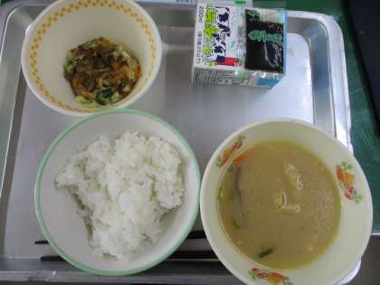 本日の献立は,ごはん,ミルク,豚汁,カルちゃん焼き手作りソースがけ,のりの佃煮の5品です。