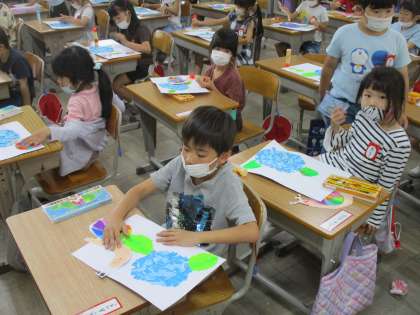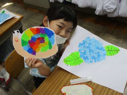 図工の時間です。「カタツムリとあじさい」の絵に取り組んでいます。めあては「絵をしあげよう」。あじさいとカタツムリの絵をドッキング。かわいい素敵な作品ができたようです。