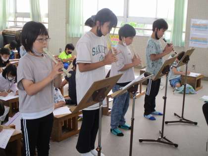 音楽の時間です。めあては「静かに,真剣に,全力で」。リコーダーのテストにチャレンジ。曲は「小さな約束」。しっかり演奏する姿はめあて達成。「符号のテスト勉強」もがんばっていました。「符号のテスト」もバッチリかな?