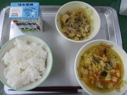 本日の献立は,ごはん,ミルク,サンラータン,チンジャオロースの4品です。