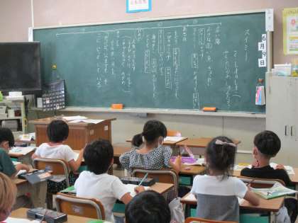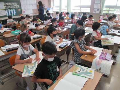 国語の時間です。「スイミー」を勉強しています。本読みのポイントを先生から教えてもらい,みんなで音読にチャレンジ。しっかり声を出して「スイミー」を読めました。