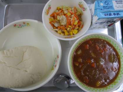 本日の献立は,オリーブパン,ミルク,ひよこ豆のカレーシチュー,ホットサラダ手作りドレッシング和えの4品です。