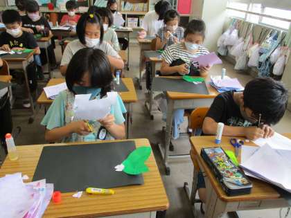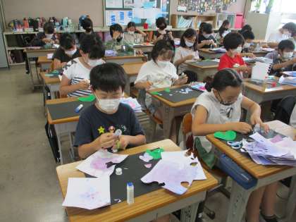 白い紙に絵の具をにじませた後,アジサイの花の形に切り取りました。