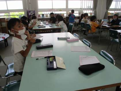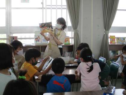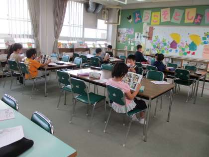 学校図書館で本を借りて読書をしました。司書の先生に「おすしやさんに いらっしゃい!」の読み聞かせをしていただきました。