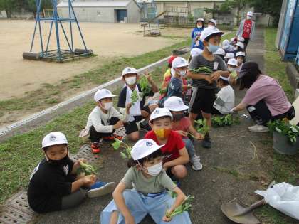 生活科で今,1年生は「アサガオ」,2年生は「やさい」を育てています。毎日の水やりをがんばってます。そこで,1・2年生の子どもたちを「がんばる東っ子」として紹介します。「アサガオ」も「やさい」も大きく育って,大きな花や野菜がたくさんできるいいですね。大切にお世話をしてくださいね。