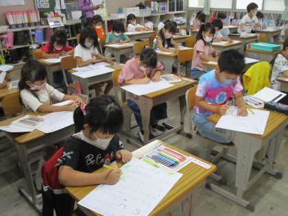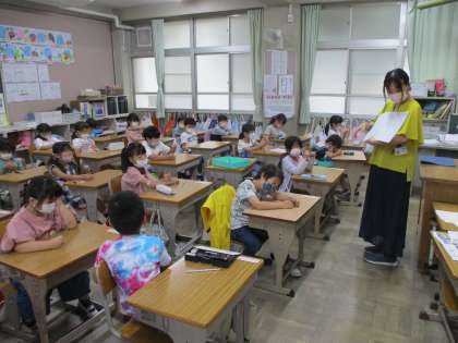 国語の時間です。ひらがなを勉強しました。今日は「の」と「と」。めあては「「まがり」の形に気を付けて書こう」。先生と「まがり」の形の書き方を確認。ワークシートにしっかり取り組みました。「の」と「と」もかっこよく書けたようです。
