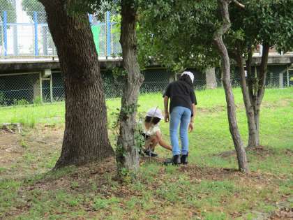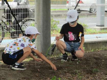 運動場で工作で使う材料を探しました。