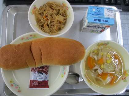 本日の献立は,コッペパン,ミルク,野菜スープ,麻婆春雨,チョコレートクリームの5品です。