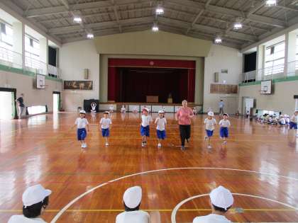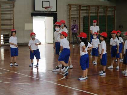 体育の時間です。シャトルランをしました。6年生に手伝ってもらい,測定。そのあと,ドッジボールをしました。6年生との合同体育楽しかったようです。