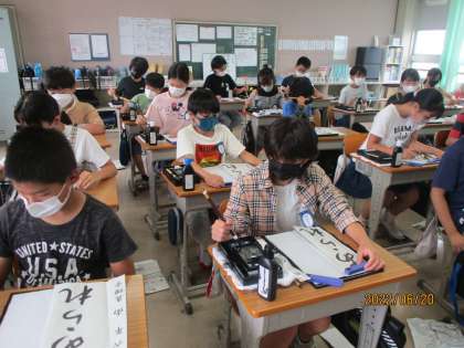 「はらい」に着目して,毛筆で「あられ」の練習をしました。