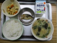 本日の献立は,ソフトパン,ミルク,ペペロンチーノ,ポテトサラダマヨネーズ風ドレッシング和えの4品です。