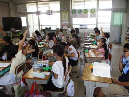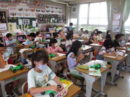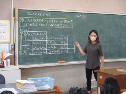 ゴムの力で動く車について,実験の結果を見ながら,ゴムを伸ばす長さと車が進む道のりに関係があるのか考えました。
