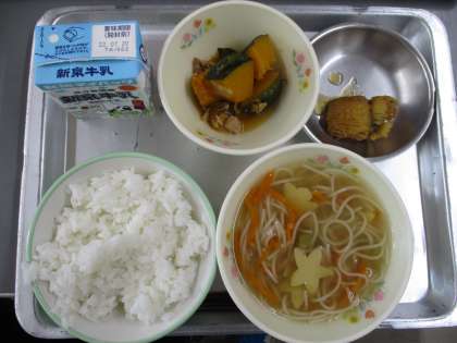 本日の献立は,ごはん,ミルク,七夕すまし汁,カボチャのうま煮,はもの梅ソースの5品です。