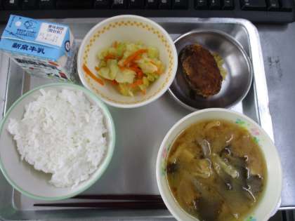 本日の献立は,ごはん,ミルク,みそ知る,メンチカツ手作りソース掛け,野菜ソテーの5品です。