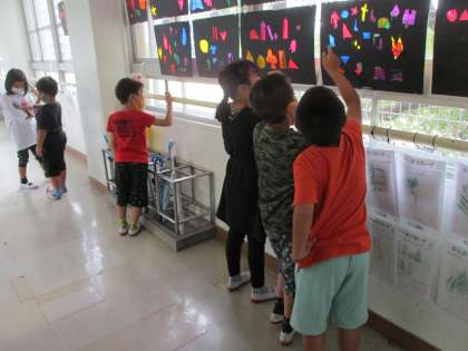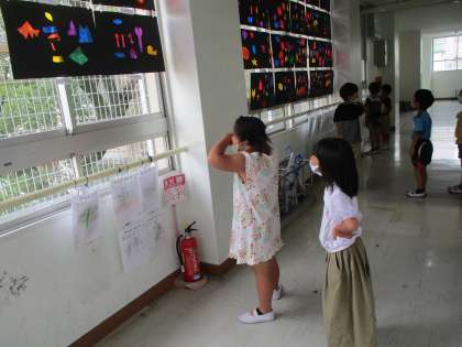 3時間目,教室の前を通ると,子どもたちが「ひかりのプレゼント」の作品を見ていました。友だちの作品を鑑賞.いいところを見つけらたかな?
