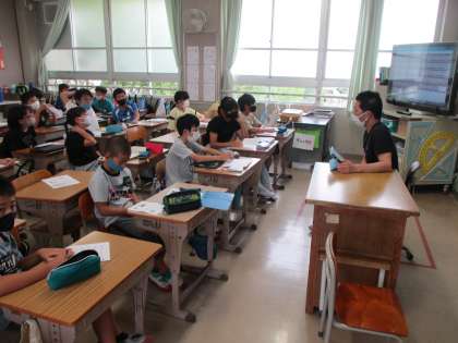 外国語の時間です。授業の最後に,アンケートで1学期の振り返りをしました。一学期の英語の先生との勉強,どうだったかな?二学期も英語の勉強楽しくがんばってほしいです。