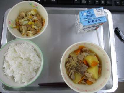 本日の献立は,ごはん,ミルク,肉じゃが,豆腐サラダの4品です。
