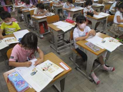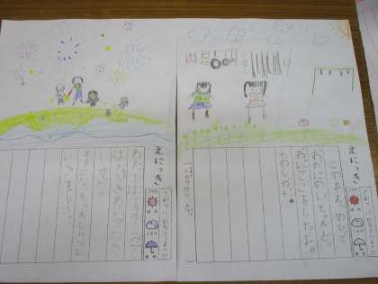 国語の時間です。「こんなことがあったよ」で絵日記の勉強をしました。先生と書くことのポイントの確認。そのあと絵日記にチャレンジ。「プール」「花火大会」など…楽しい日記が書けたようです。夏休みの絵日記も楽しみです。