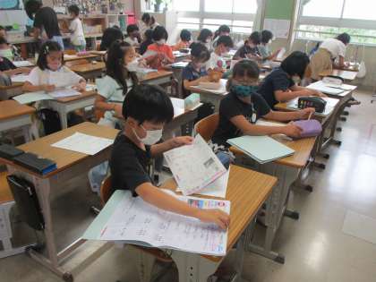算数の時間です。次の時間に1学期のまとめのテストがあります。振り返りのプリントに取り組み,先生とみんなでテスト勉強をしました。テストがんばってや。