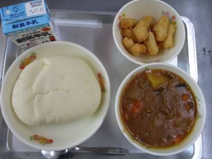 本日の献立は,オリーブパン,ミルク,米粉カレー,いかフリッターの4品です。