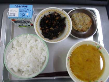 本日の献立は,ごはん,ミルク,みそ汁,ひじきの甘煮,豆腐ハンバーグの5品です。