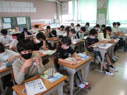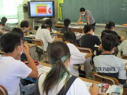 英語の時間です。今日は次回のテストに向けての復習と夏の思い出の英語バージョンの下書きの仕上げに取り組みました。両方とも,バッチリできたかな?テストがんばってや。