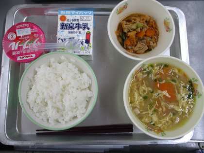 本日の献立は,ごはん,ミルク,トック,豚キムチ,ヨーグルトの韓国料理をメインにした5品です。