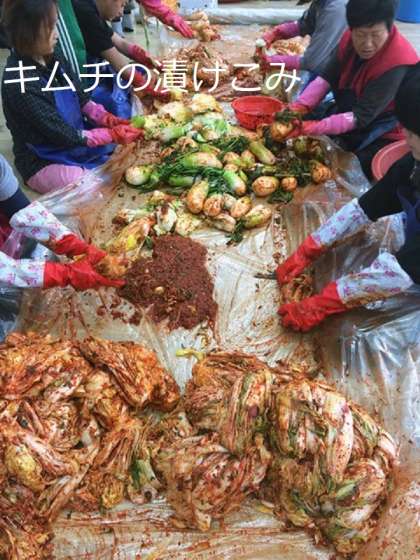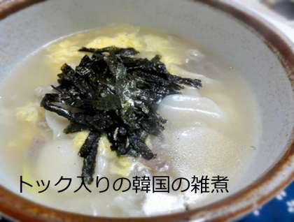 トック(떡)は,米(うるち米またはもち米)で作った朝鮮半島の餅,あるいは餅菓のことです。日本の餅同様,料理やお菓子の材料として幅広く使われています。本日はスープの具として使われています。キムチは白菜ににんにくとにらを加えて漬け込んだ朝鮮半島での伝統的な保存食です。16世紀に日本からトウガラシが伝えられ,現在食べられているキムチになりました。