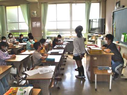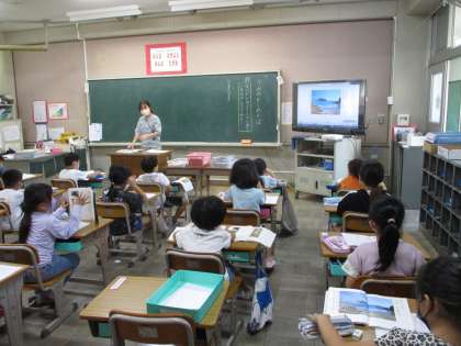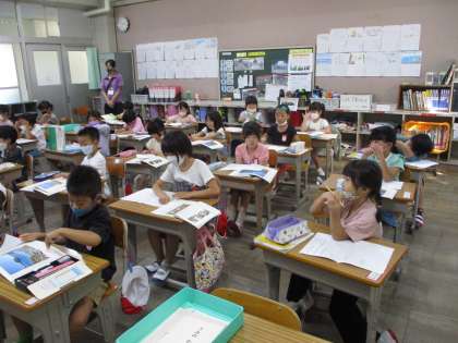 「うみのかくれんぼ」の朗読を聞いて海の生物の名前と隠れ方をワークに書きました。