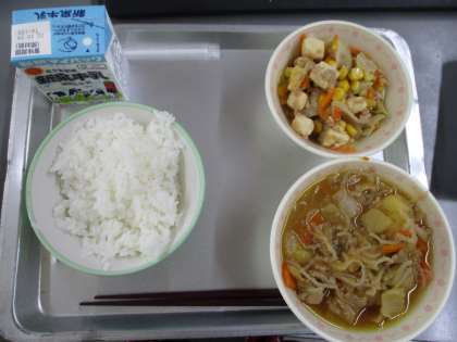 本日の献立は,ごはん,ミルク,肉じゃが,豆腐サラダの4品です。